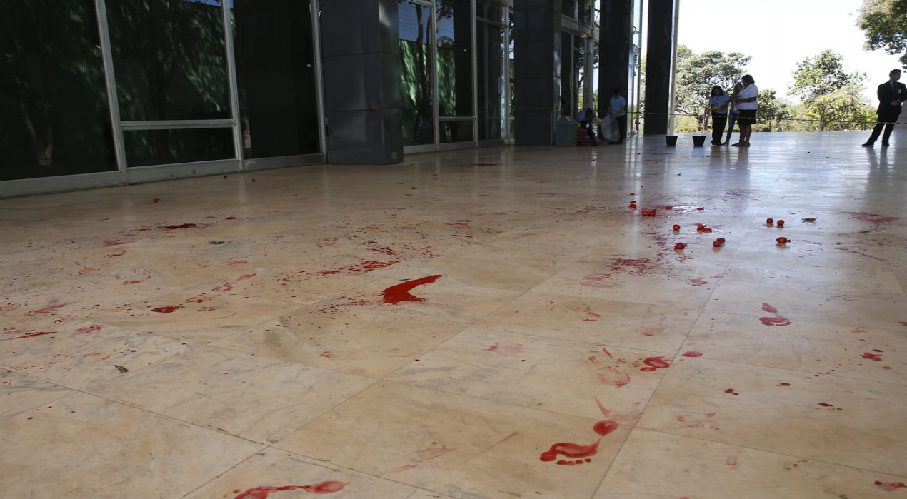 Cerca de 20 manifestantes vestidos com cartolinas representando a Constituição e a Carteira de Trabalho protestaram hoje (23) no Supremo Tribunal Federal (STF) e derramaram tinta vermelha em uma das entradas do prédio principal da Corte, por onde os ministros costumam entrar para as sessões plenárias, área conhecida como Salão Branco.