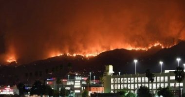Cerca de 450 bombeiros tentam apagar um incêndio em Burbank, no Vale de San Fernando, em Los Angeles,…