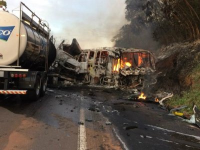 A Defesa Civil de Cafezal do Sul informou que o caminhão estava carregado com leite. Com o impacto da batida, os veículos pegaram fogo.