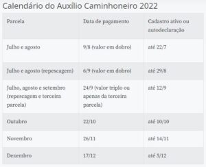 “Esses caminhoneiros poderão fazer a regularização de sua situação junto à Auxílios Caminhoneiro e Taxista [Agência Nacional de Transportes Terrestres] até o dia 10 de outubro, assim como registrar a autodeclaração que foi disponibilizada até as 18h do dia 10 de outubro”, disse Veras, em entrevista ao Repórter Nacional, da Rádio Nacional.
