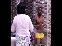 Douglas mostrou que já está à vontade na casa, tanto é que tirou a sunga para tomar banho. Ao entrar no banheiro, Mariza estava escovando os dentes e ele ainda avisou: “Eu vou tirar a sunga aqui, tá”. O moreno ficou completamente nu e Mariza continuou conversando com ele, até terminar a escovação. Adrilles e Fernando também estavam no banheiro. Ao sair do banho, ainda se secou inteiro em frente as câmeras.