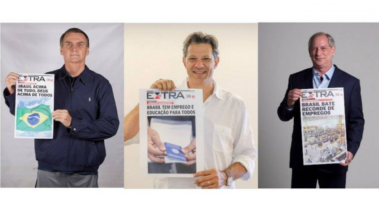 Atualmente, quase 13 milhões de brasileiros estão sem emprego no país. O número representa um índice de 12,1% da população economicamente ativa. Os dados do IBGE demonstram por que o desemprego é uma das maiores preocupações do brasileiros. E, por isso mesmo, o tema escolhido por dois candidatos à Presidência da República — Fernando Haddad (PT) e Ciro Gomes (PDT) — para estar na manchete de jornal que gostariam de ver publicada, ao fim de seus mandatos, foi o aumento no número de empregos. Jair Bolsonaro (PSL) escolheu um tom patriótico e religioso para a chamada criada, reproduzindo o seu slogan de campanha.