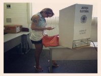 A cantora Alinne Rosa, 30 anos, agiu contra a lei na hora de votar em seus candidatos nesse domingo (7). Ela foi fotografada usando o celular na cabine ao votar, o que é proibido pela legislação eleitoral. A imagem foi postada por ela mesma na rede social Instagram.