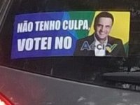 A foto acima mostra um adesivo com a foto do tucano e a legenda “Não tenho culpa, votei no Aécio”, em alusão às medidas que marcam o início do novo governo da presidente petista. A imagem foi feita no bairro das Graças, Zona Norte do Recife.