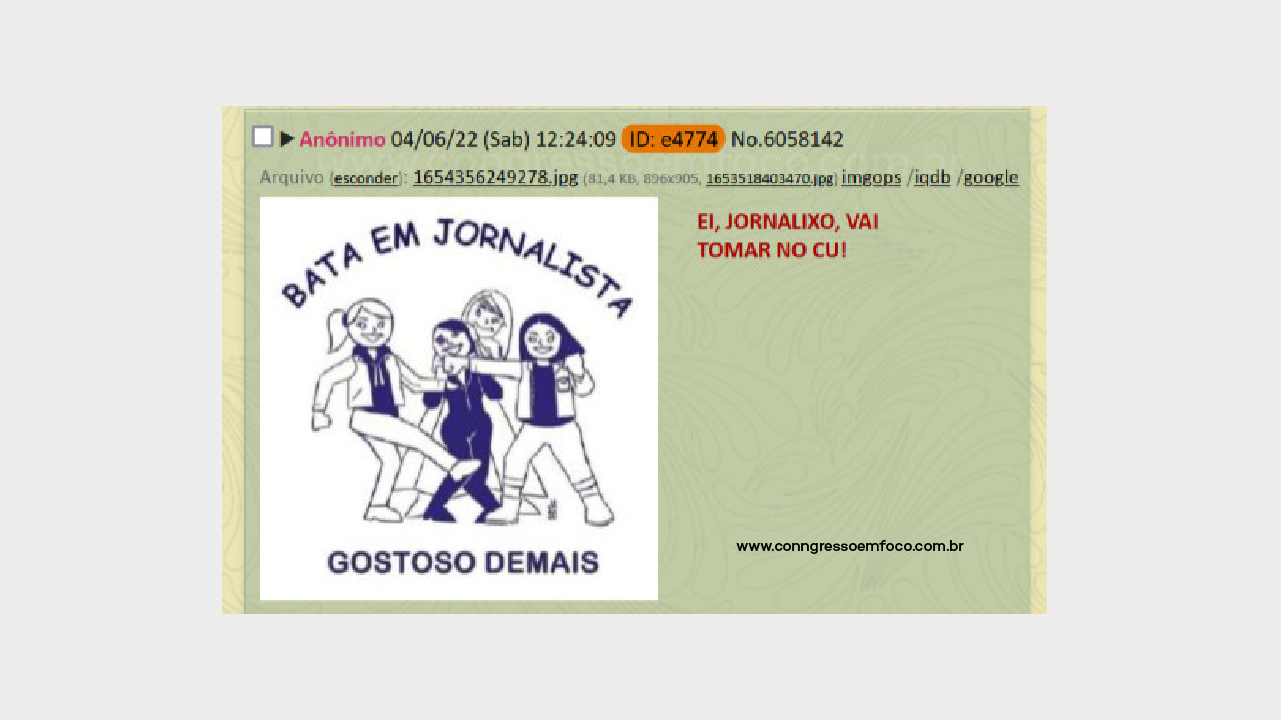 Outro usuário sugere a divulgação na plataforma de uma campanha para ludibriar e desmoralizar eventuais jornalistas “infiltrados”. “E se a gente começar a espalhar que o chan tem um gabinete do ódio chamado de ‘tábua secreta’? Será que a gente consegue fazer os imbecis da imprensa fazerem cobertura 24h sobre o que seria essa ‘tábua secreta’ e repetir todas as histórias que inventarmos sobre ela? Será que conseguimos fazer um jornalista disfarçado ‘se adentrar nos confins da dipi webi’ da caravela e visitar uma tábua secreta?” Outro internauta publicou um meme coma mensagem: “Bata em jornalista. Gostoso demais”. Também há imagem de corpos humanos desfigurados.