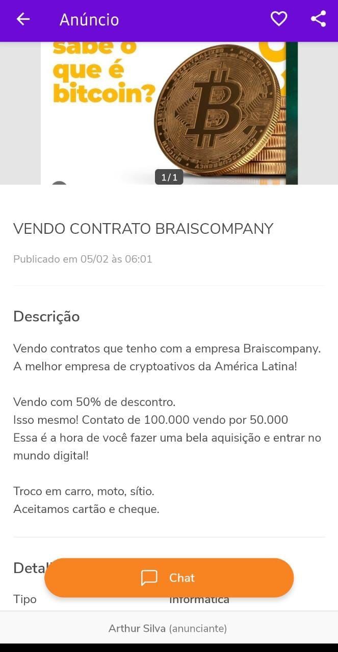 A Braiscompany oferece um “investimento” em que o “investidor” compra um valor mínimo de Bitcoins. Depois disso, o “investidor” cede em aluguel, por no mínimo 12 meses, os seus Bitcoins para a Braiscompany “treidar” os seus investimentos e devolver mensalmente um valor do aluguel. Veja mais detalhes: https://oantagonista.uol.com.br/opiniao/o-caso-braiscompany/
