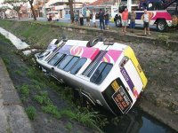 Um microônibus caiu em um valão na rua Arthur Rios, em Campo Grande, na zona oeste do Rio de Janeiro. O coletivo estava indo da garagem para o ponto final da linha e não transportava passageiros.