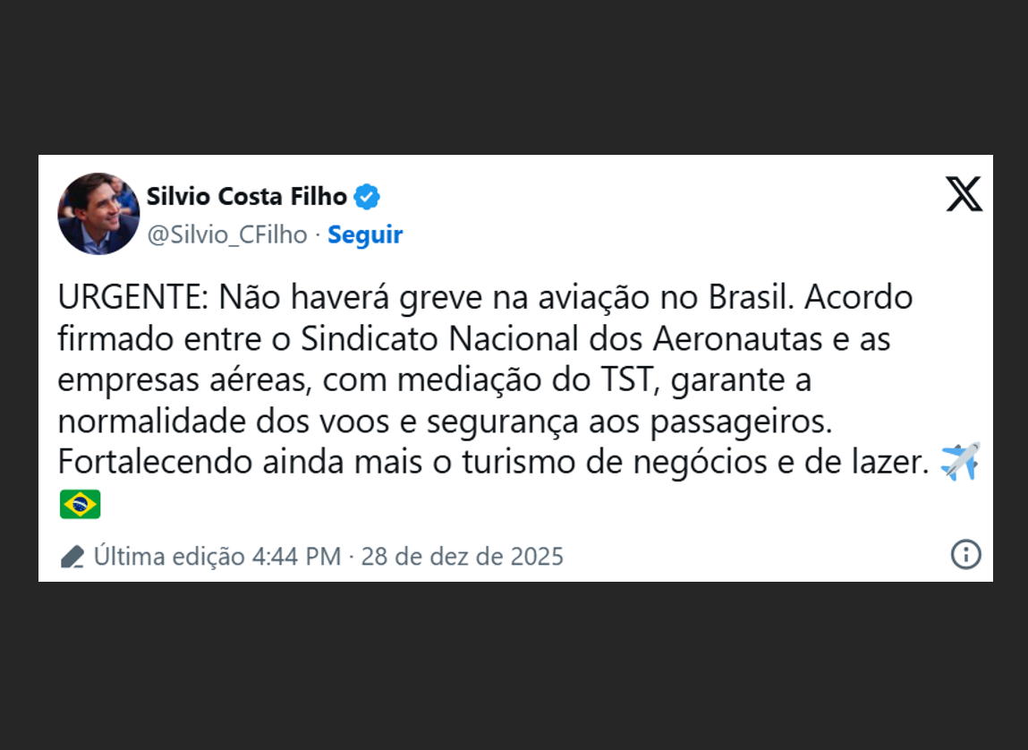 “URGENTE: Não haverá greve na aviação no Brasil. Acordo firmado entre o Sindicato Nacional dos Aeronautas e as empresas aéreas, com mediação do TST, garante a normalidade dos voos e segurança aos passageiros. Fortalecendo ainda mais o turismo de negócios e de lazer”, escreveu Silvio Costa no X, antigo Twitter.