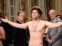 De repente, Samir (Marco Ricca) cutuca o irmão mais velho, chamando sua atenção para o que está havendo na escada. Salomão vira-se e, ao bater os olhos em Márcio (Thiago Fragoso), completamente nu, descendo os degraus, fica pasmo na mesma hora.