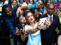 Vestindo calça vermelha e camisetinha branca, a cantora foi assediada por centenas de fãs, bque a aguardavam no local. Simpática, a loira atendeu vários deles, fazendo selfies, dando autógrafos e distribuindo sorrisos.