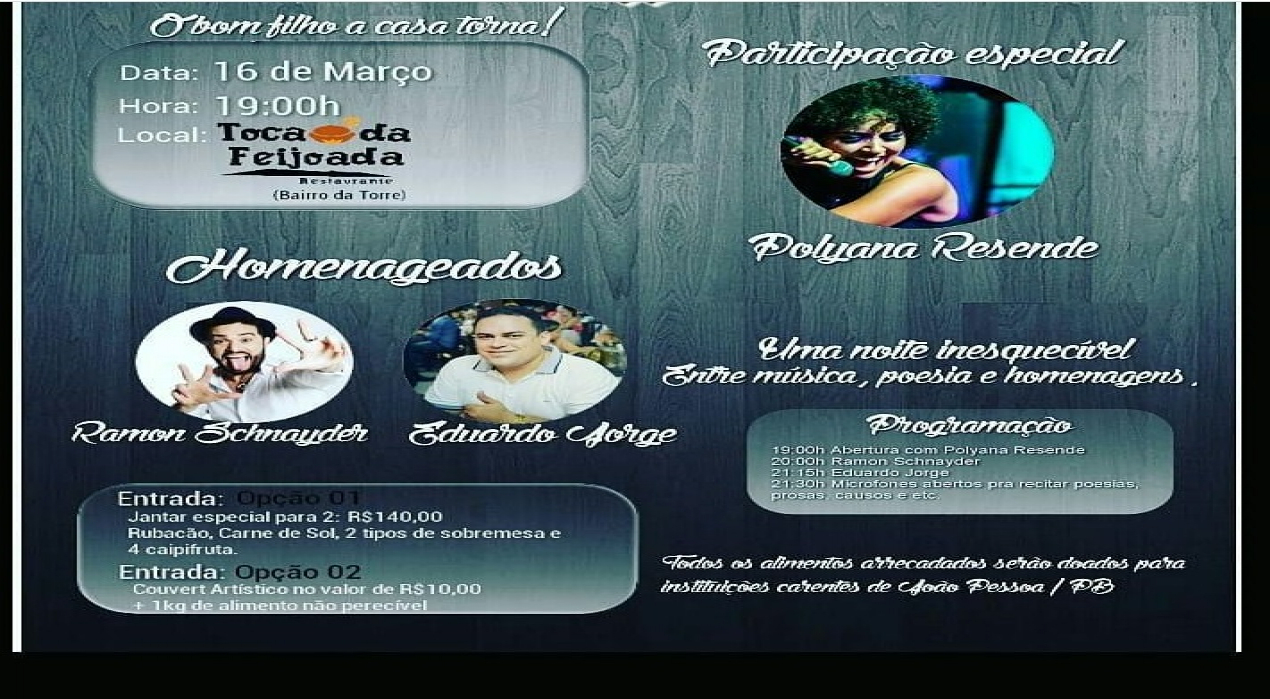 Com o objetivo de promover a valorização cultural e o respeito ao próximo, o restaurante ‘Toca da Feijoada’, localizado no bairro da Torre, em João Pessoa-PB, realiza na próxima sexta-feira (16), a partir das 19h, uma noite especial que mesclará ótima comida regional brasileira, músicas ao vivo e filantropia. Essa é a nona edição deste que é considerado um dos melhores sarais poéticos da cidade.
