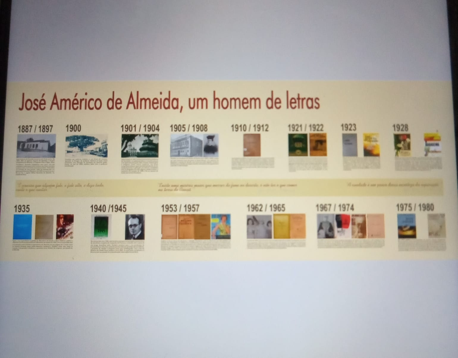 A linha do tempo “José Américo de Almeida, um homem de letras” foi elaborada pela seguinte equipe: Jivago Correia Barbosa, Juca Pontes, Kárcia Lúcia Oliveira Diniz, Lúcia de Fátima Guerra Ferreira, Luiz Mário Dantas Burity, Nadígila da Silva Camilo e Rossiane Delgado de Albuquerque Cordeiro.