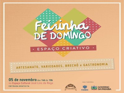 Projeto já consolidado na programação regular do Espaço Cultural José Lins do Rego, a “Feirinha de Domingo” terá mais uma edição no próximo dia 5, na Capital. O evento ocupa a Praça do Povo com artesanato, variedades, brechó, venda de antiguidades, gastronomia, food bikes e expositores distribuídos pelo local.
