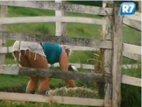 Após dar bom dia aos cavalos e pegar o feno, ela caminhava até a área onde fica o burro Amoroso. Quando abaixou para mexer no feno, ela deixou à mostra uma parte do bumbum.