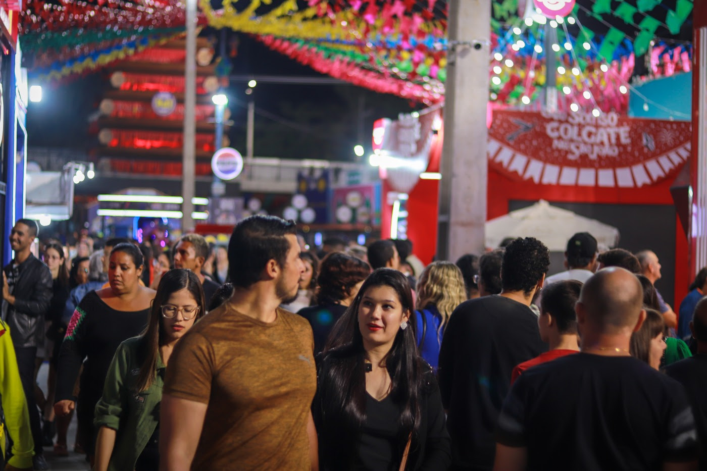 Em uma das ilhas de forró, Renata Frazão dança com seu namorado e compartilha sua motivação para estar ali: ’Aproveitamos a oportunidade, já que não há um show específico hoje. Gostamos de vir para conhecer a nova estrutura, especialmente com a ampliação deste ano. Estávamos ansiosos para ver como ficou.’