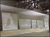 A monumental obra cinza e branca, composta por cinco telas com cerca de 3m de altura, cada, e um total de 17m de comprimento, mostra a conhecida imagem da Mona Lisa com uma tinta escorrendo pelo seu rosto e corpo, como se ela estivesse chorando e também ferida na testa.