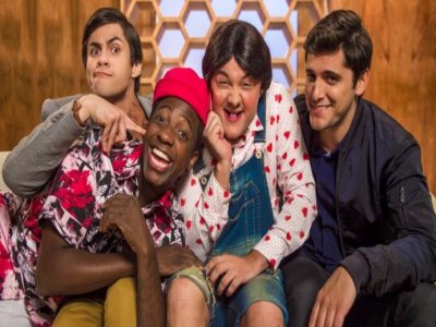 A imagem mostra Lucas Veloso como Didico, Mumuzinho como Mumu, Gui Santana como Zaca e Bruno Gissoni como Dedeco.