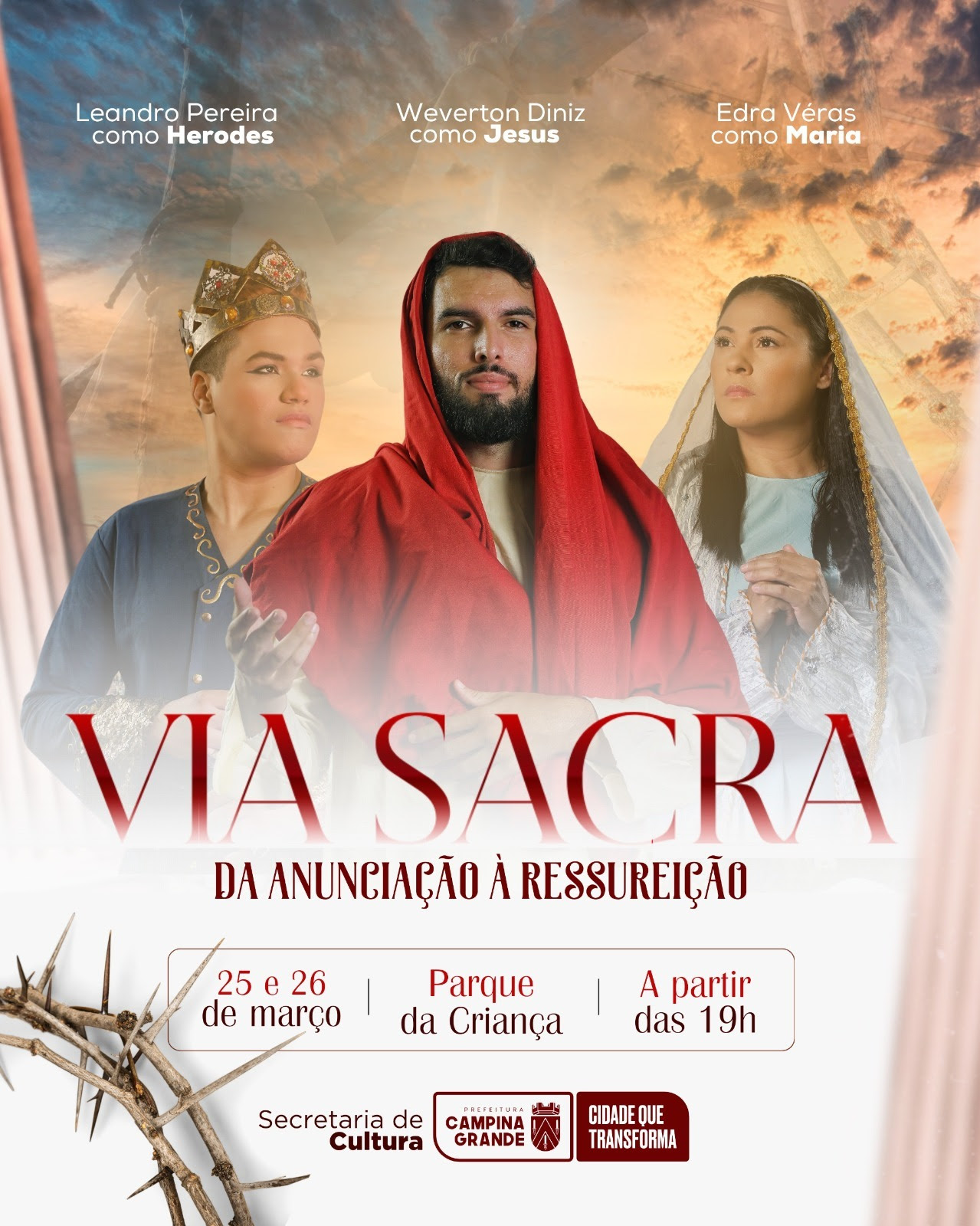 “Via Sacra: da anunciação à ressurreição” reúne a música, a dança e a teatralização para retratar um recorte da história de Jesus Cristo. O objetivo é, além de proporcionar para as pessoas uma opção de lazer e acesso à cultura, impulsionar novos talentos advindos das aulas de arte-educação do Centro Cultural Lourdes Ramalho.