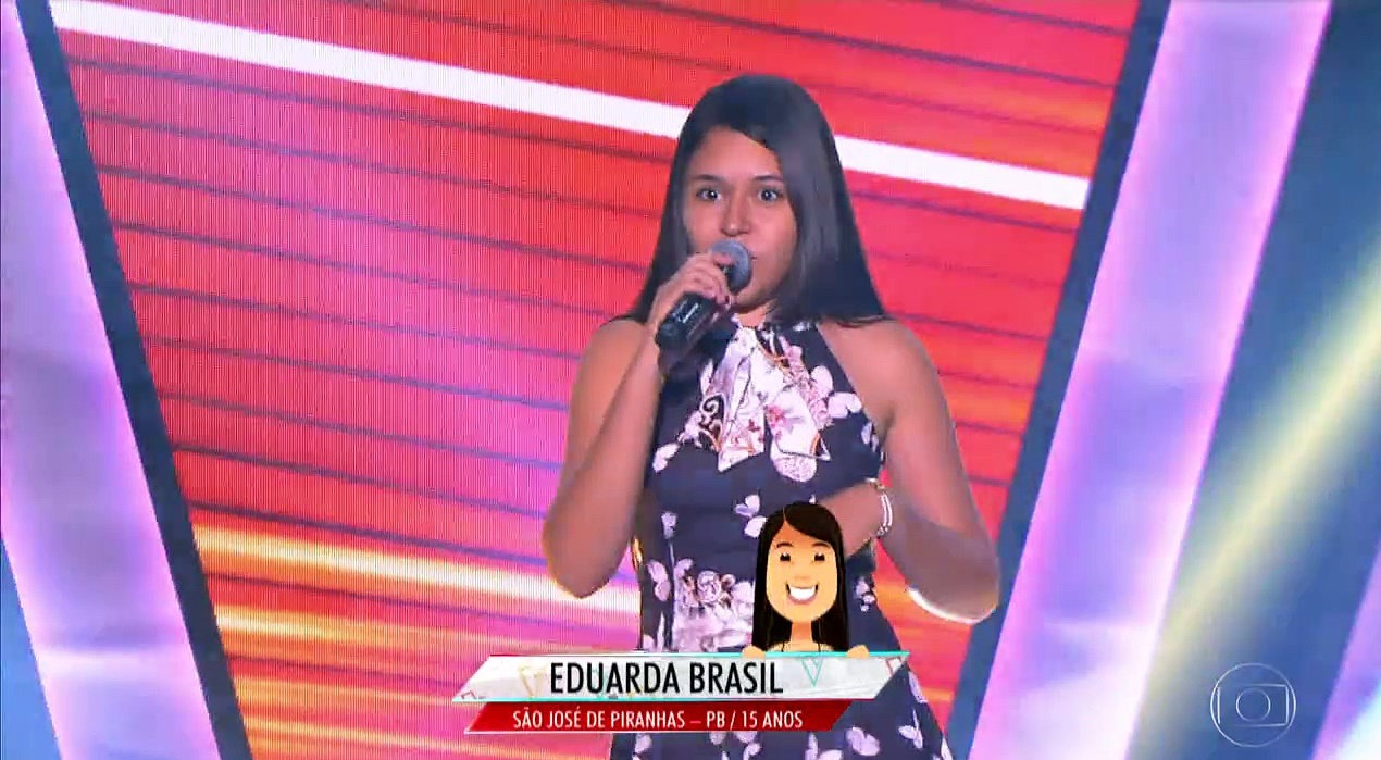 Com um vozeirão de arrepiar, Eduarda Brasil chegou ao The Voice Kids para mostrar toda a riqueza da música nordestina. Nascida em Cajazeiras, na Paraíba, a adolescente aos 12, decidiu se apresentar com a família, mesma época em que venceu seu primeiro festival.