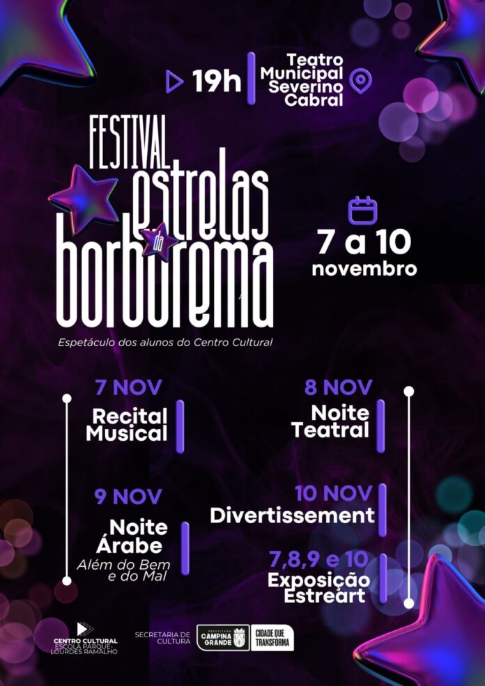 A Prefeitura de Campina Grande, por meio da Secretaria de Cultura (Secult), realizará, entre 7 e 10 de novembro, o “Festival Estrelas da Borborema”, no Teatro Municipal Severino Cabral. O evento marca o encerramento de aulas do ano letivo de 2022 do Centro Cultural Escola Parque – Lourdes Ramalho (CCLR), com apresentações das 59 turmas da instituição. Nesta terça-feira (08), a partir das 19h, no Teatro Municipal Severino Cabral, haverá a apresentação da peça ‘O Auto do Rei’.