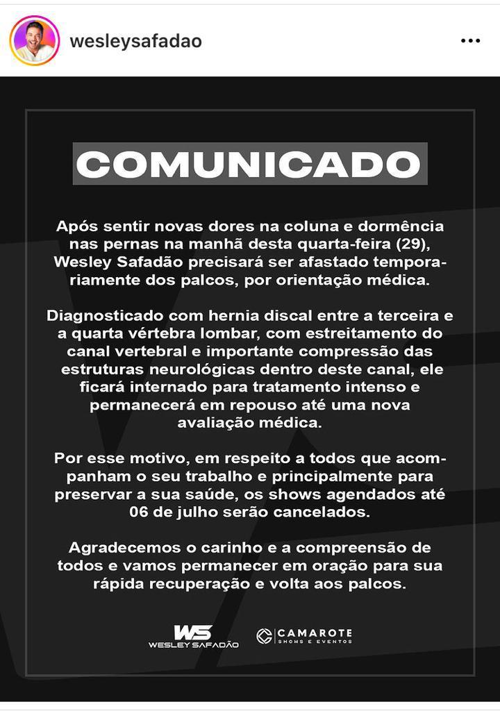 Em comunicado publicado em suas redes sociais na tarde desta quarta-feira (29), o cantor Wesley Safadão informou o cancelamento de todos os shows agendados até o dia 06 de julho por conta de problemas na coluna. Conforme o comunicado, a decisão ocorre após o artista sentir novas dores na coluna e dormência nas pernas.