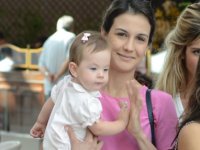 Antes de entrar no estabelecimento para a refeição, Kyra parou para conversar com outras mamães que também estavam com seus herdeiros, e logo ficaram completamente derretidas com Ayra, que parecia estar bastante confortável sendo carregada pela mãe em um canguru bastante utilizado para os cuidados com bebês.
