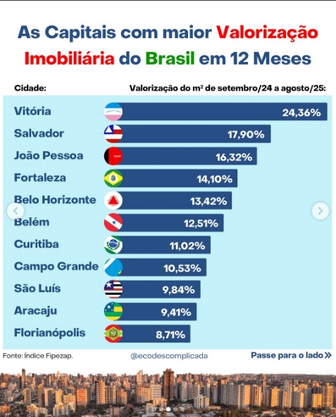 Nós últimos 12 meses, João Pessoa detêm a terceira maior valorização imobiliária entre as capitais de acordo com o Indice Fipezap, com alta do preço médio de venda residencial de 16,32%.
