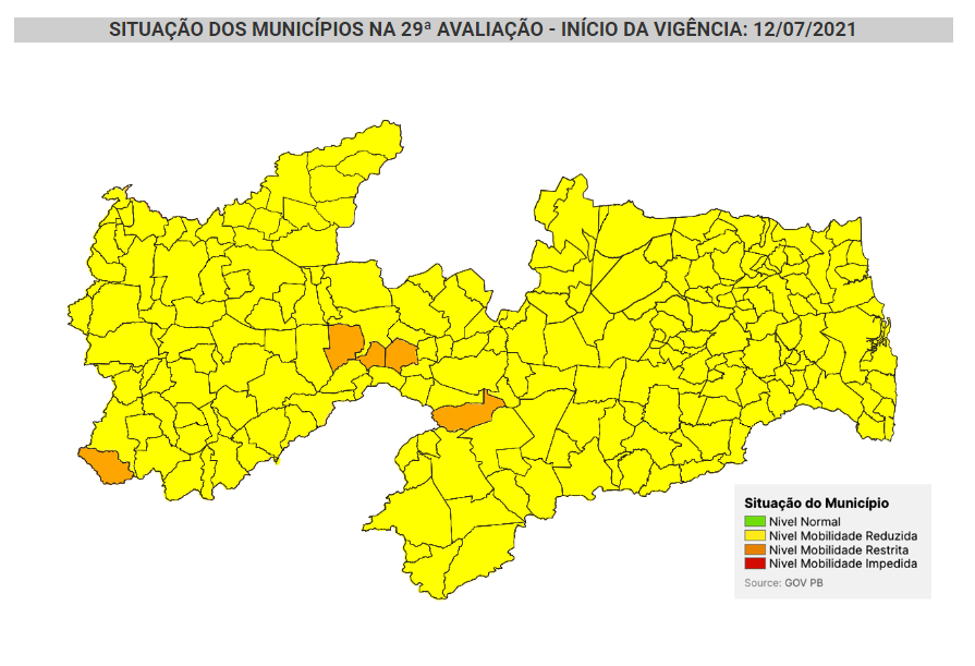 Segundo o relatório, estão em bandeira laranja as cidades de Santa Inês, São José do Bonfim, Cacimba de Areia, Santa Terezinha e São José dos Cordeiros. Na última avaliação, de 26 de junho, 153 cidades estavam na bandeira laranja, 62 na bandeira amarela, 8 na bandeira vermelha e nenhum município estava na bandeira verde. Apesar desta situação das novas bandeiras favoráveis, o estado segue sem nenhuma cidade na bandeira verde.