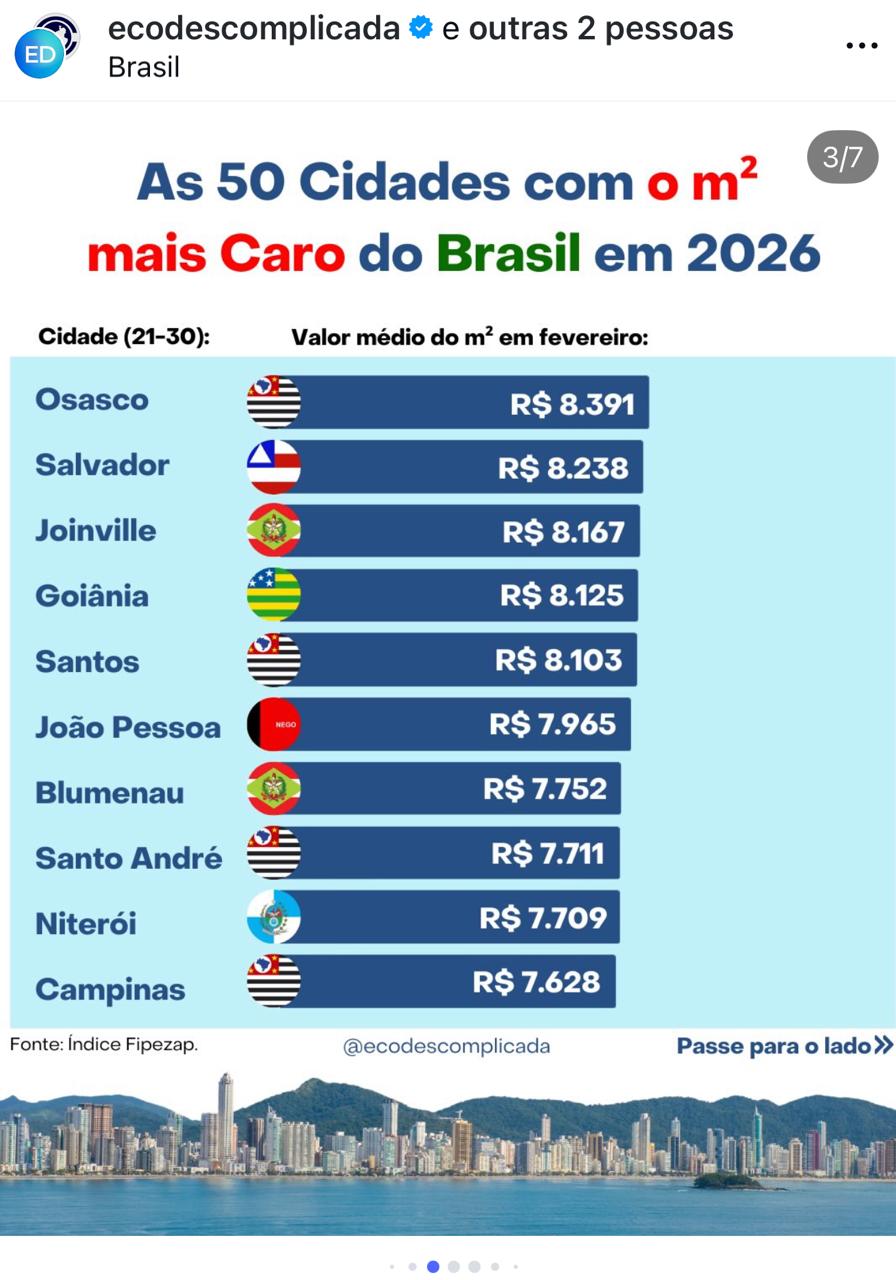 Quando analisadas as 56 cidades brasileiras (quantidade trazida pelo FipeZap) com o m² mais caro, nota-se que a capital paraibana está 26ª posição nacional a frente de cidades como Blumenau em Santa Catarina, Niterói no Rio de Janeiro, dentre outras.