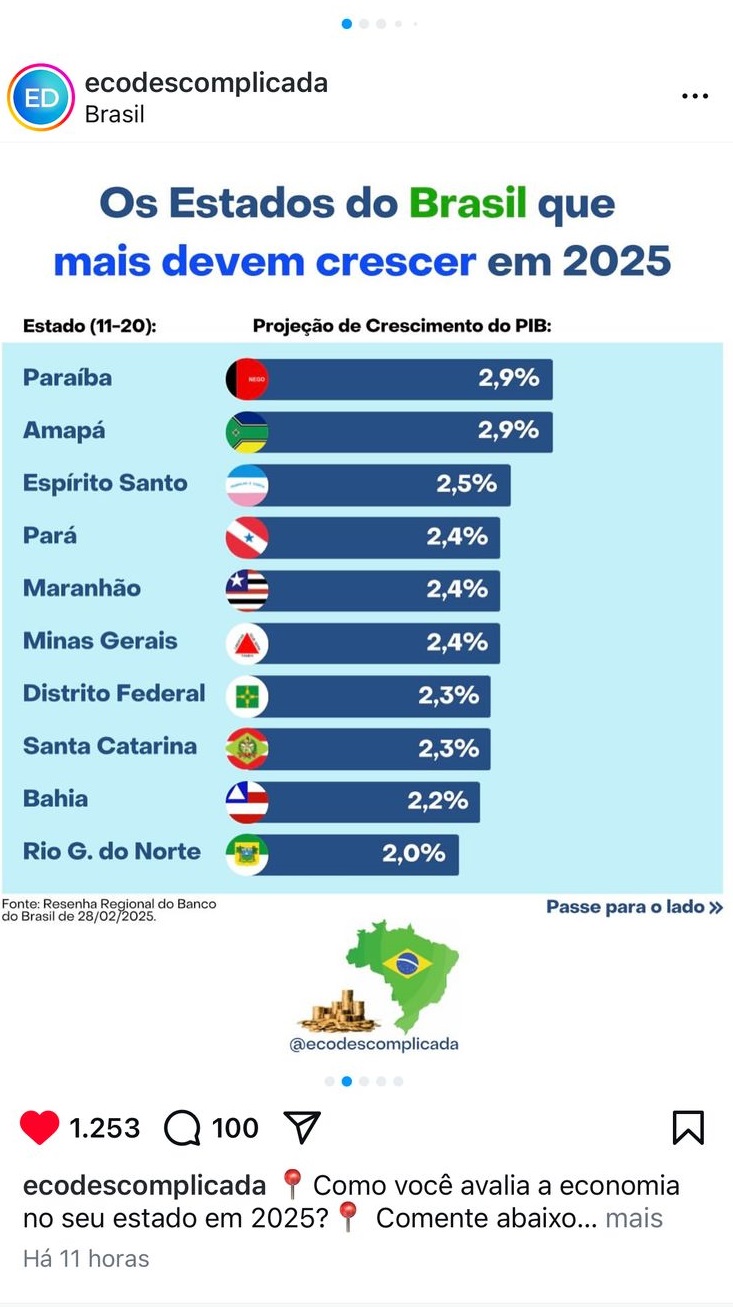 Levantamento divulgado no último dia 28/02/2025, pela resenha regional do Banco do Brasil, onde apura os estados brasileiros que mais devem crescer economicamente neste ano, a Paraíba alcançou uma posição de destaque, sendo o 2º estado do Nordeste com maior projeção de crescimento do Produto Interno Bruto e o 11º estado do Brasil que mais deve aumentar PIB.