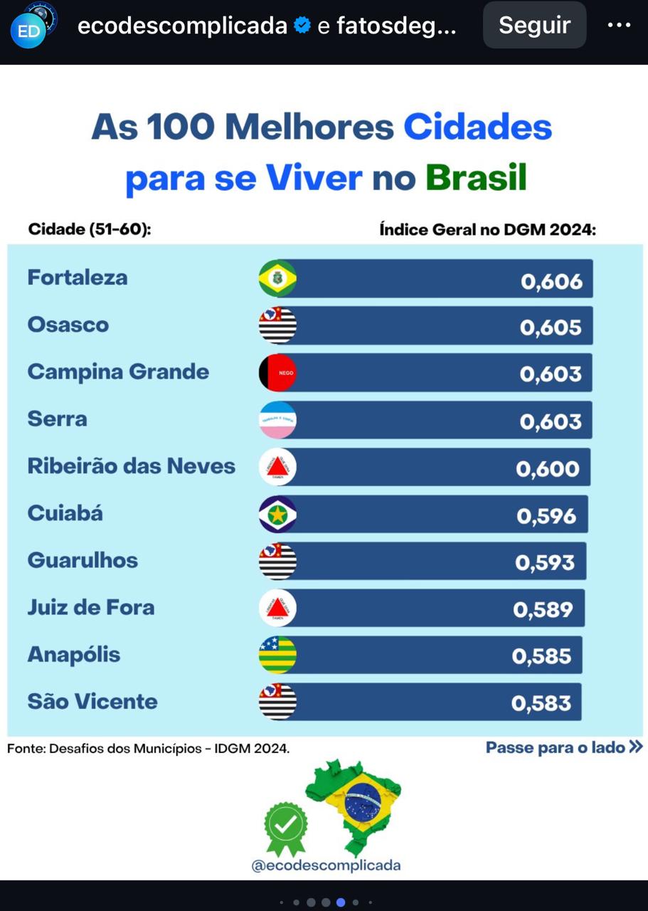 O estudo Desafios da Gestão Municipal (DGM) divulgado ontem (29), pelo Instagram especializado em economia @ecodescomplicada traz uma análise da evolução recente das 100 maiores cidades brasileiras, que representam quase metade do PIB brasileiro, com base no IDGM, indicador sintético que reúne 15 indicadores em quatro áreas essenciais para a qualidade de vida da população: i) educação, ii) saúde, ili) segurança e iv) saneamento e sustentabilidade., no qual mede a qualidade de vida dos seus habitantes. Neste âmbito, Campina Grande administrada pelo prefeito Bruno Cunha Lima se destaca, sendo a 1ª da Paraíba, 2ª do Nordeste e a 53ª cidade do Brasil com melhor qualidade de vida.