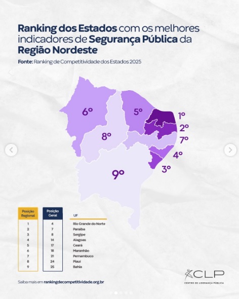 O Ranking de Competitividade dos Estados 2025, elaborado pelo Centro de Liderança Pública (CLP), apontou que a Paraíba é o segundo estado do Nordeste e o sétimo do Brasil com melhor indicador de Segurança Pública. Para se ter ideia, no NE a Paraíba só fica atrás do estado do Rio Grande do Norte. O pilar de Segurança Pública mostra que a preservação da ordem, a proteção dos direitos individuais e a estabilidade interna são condições fundamentais para o desenvolvimento e o bem-estar social. Sem esses elementos, um país pode caminhar para a fragilidade institucional.