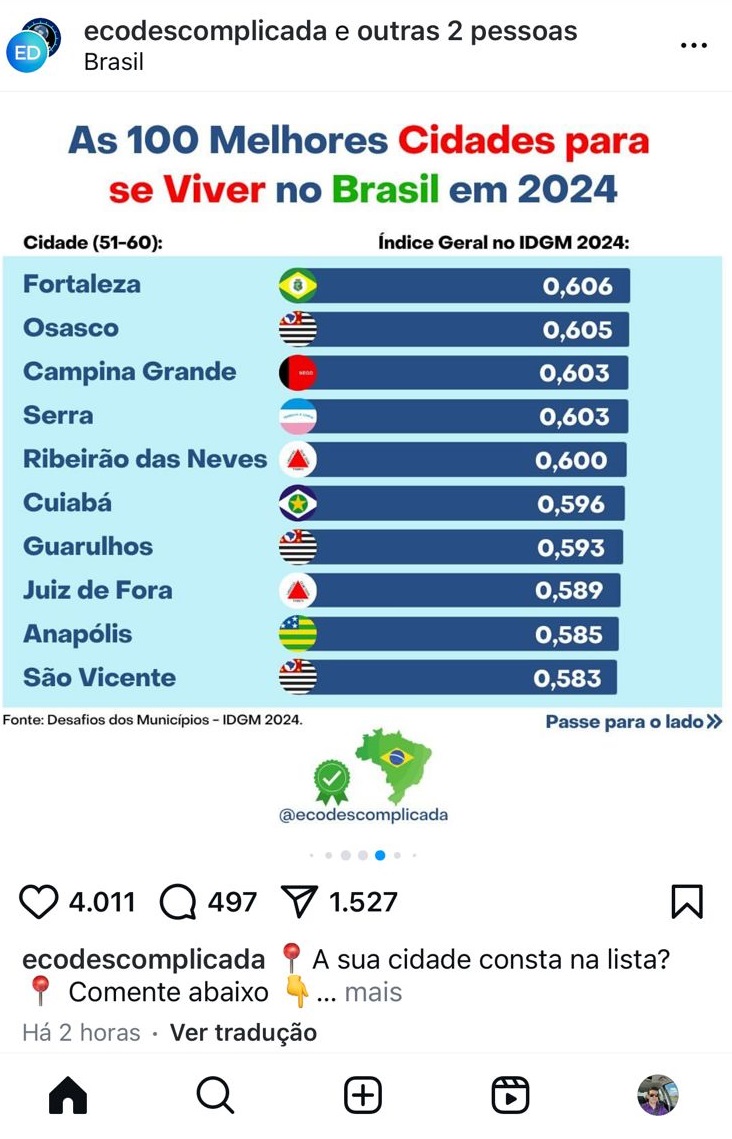 O estudo Desafios da Gestão Municipal (DGM) apresentou neste final de semana um estudo divulgado pelo Instagram especializado em economia @ecodescomplicada uma uma análise da evolução recente das 100 maiores cidades brasileiras, que representam quase metade do PIB brasileiro, com base no IDGM, indicador sintético que reúne 15 indicadores em quatro áreas essenciais para a qualidade de vida da população: i) educação, ii) saúde, iii) segurança e iv) saneamento e sustentabilidade. Dentre essas cidades estão Campina Grande, administrada pelo prefeito reeleito Bruno Cunha Lima (União Brasil), na posição 53ª e João Pessoa administrada pelo prefeito reeleito Cícero Lucena (PP), na 65ª posição.