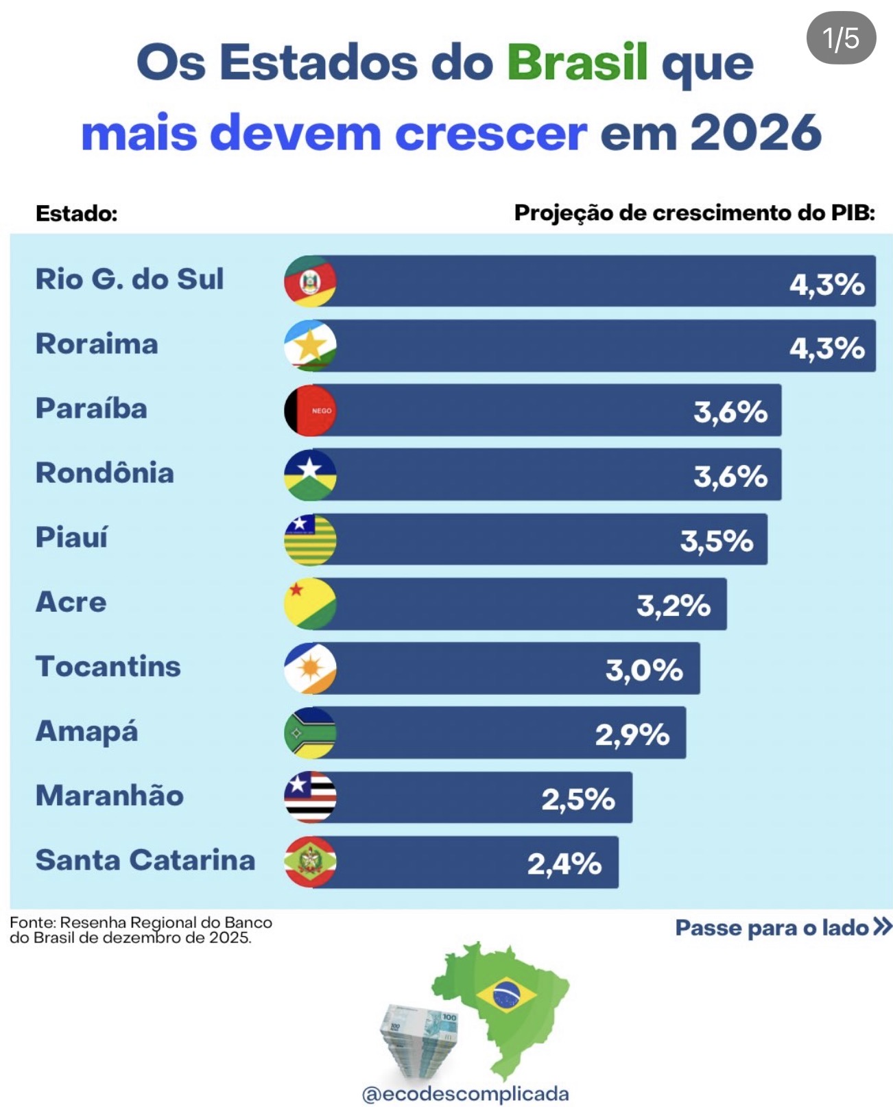 Por outro lado, para 2026, o Banco do Brasil espera uma nova desaceleração, estimando um avanço de 1,7%, que caso confirmado, será o menor crescimento do país desde 2020, o qual foi fortemente afetado pela pandemia. Confira a Resenha Regional do BB completa no link: https://share.google/ai30ehCZYA4SdynNE