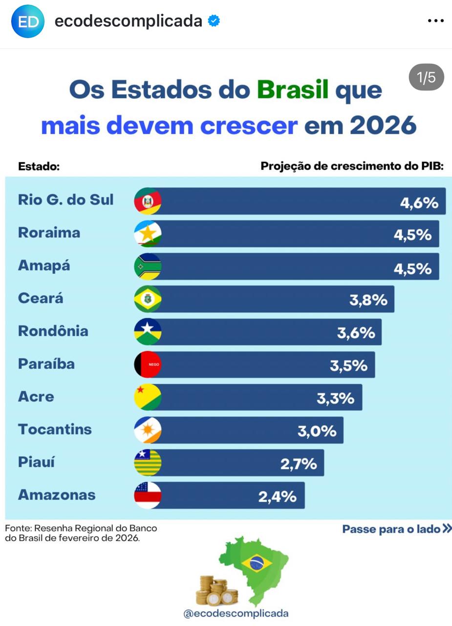 De acordo com o relatório de Resenha Regional do Banco do Brasil, disponibilizado neste mês, o Produto Interno Bruto (PIB) do Brasil deve crescer 2,0% em 2026, o que, caso confirmado, será o menor crescimento do país desde 2020, quando impactado pela pandemia, a atividade econômica registrou queda de 3,3%. Porém o estado da Paraíba se destacou, sendo o segundo do Nordeste e o sexto do País em projeção de crescimento do seu PIB.