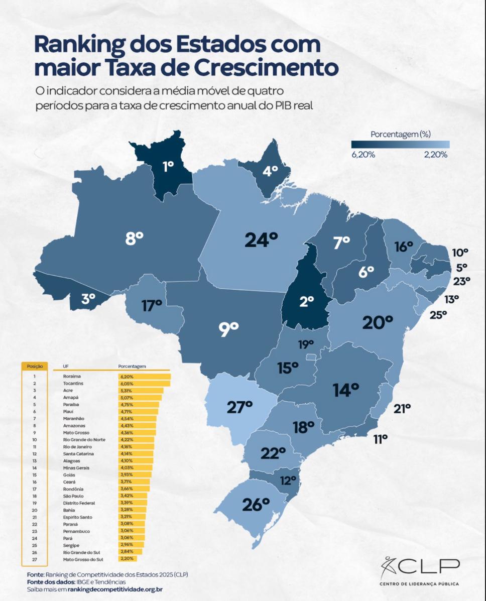Ranking dos Estados com maior Taxa de Crescimento anual dos seus Produtos Internos Brutos (PIB´s), foi divulgado ontem (25), pelo Ranking de Competitividade dos Estados 2025 (CLP). Neste âmbito a Paraíba apareceu como líder em crescimento do seu PIB no Nordeste e detentor do quinto maior crescimento no Brasil.