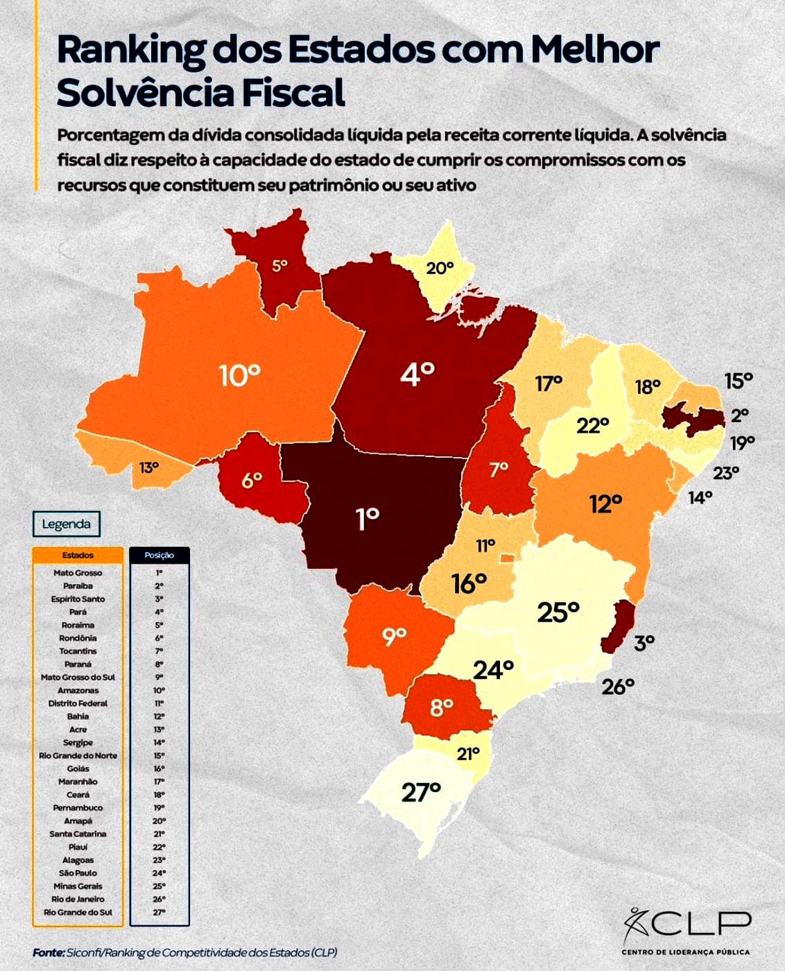 No ranking da Solvência Fiscal, os três Estados que lideram o indicador no País são por ordem: Mato Grosso, Paraíba e Espírito Santo. Já na Região Nordeste, a Paraíba lidera disparado o indicador. Os outros dois Estados mais bem colocados nacionalmente são a Bahia (12º) e Sergipe (14º).