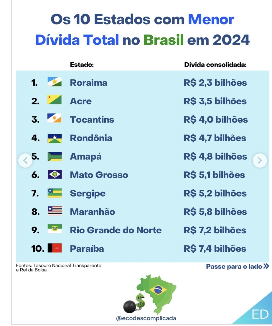 O estado da Paraíba, teve divulgado nesta semana pelo Instagram especializado em economia o @ecodescomplicada relatório do Tesouro Nacional Transparente, no qual elenca os estados brasileiros com menor dívida pública e neste âmbito o Estado da Paraíba se destaca como obtendo a 4ª menor dívidas entre os estados do Nordeste e a 10ª do Brasil.