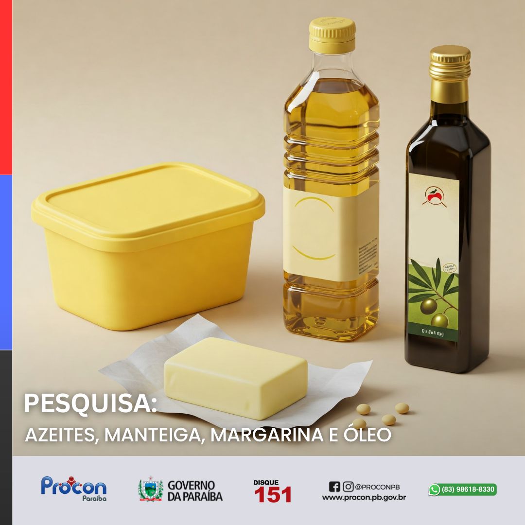 A Autarquia de Proteção e Defesa do Consumidor do Estado da Paraíba (Procon-PB), por meio do Setor de Pesquisa e Estatística, realizou no último dia 10 de março de 2025, uma pesquisa sobre o preço de azeites, margarinas, manteigas e óleos na grande João Pessoa.