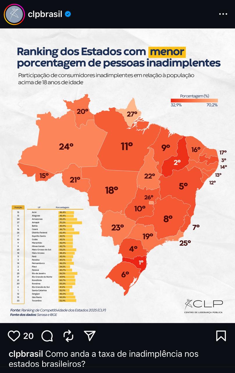 Este indicador do Ranking de Competitividade dos Estados considera a participação de consumidores inadimplentes em relação à população acima de 18 anos de idade. Ele coleta dados do Serasa e do IBGE.