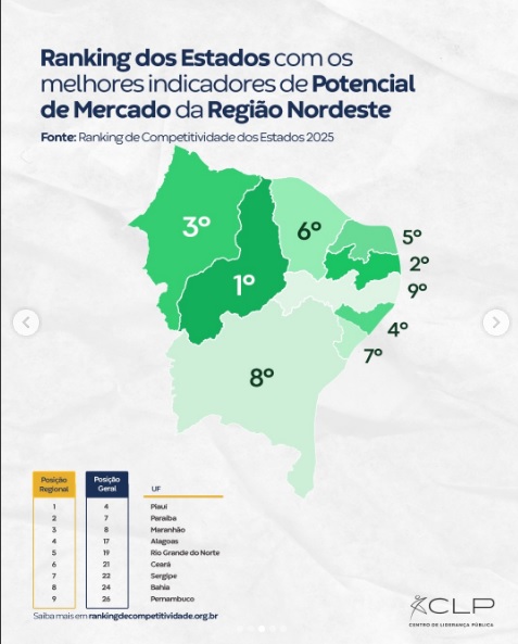 O Ranking de Competitividade dos Estados 2025, elaborado pelo Centro de Liderança Pública (CLP), apontou que a Paraíba é o segundo estado do Nordeste e o sétimo do Brasil com melhores indicadores de Mercado. Para se ter ideia, no NE a Paraíba só fica atrás do estado de Piauí.