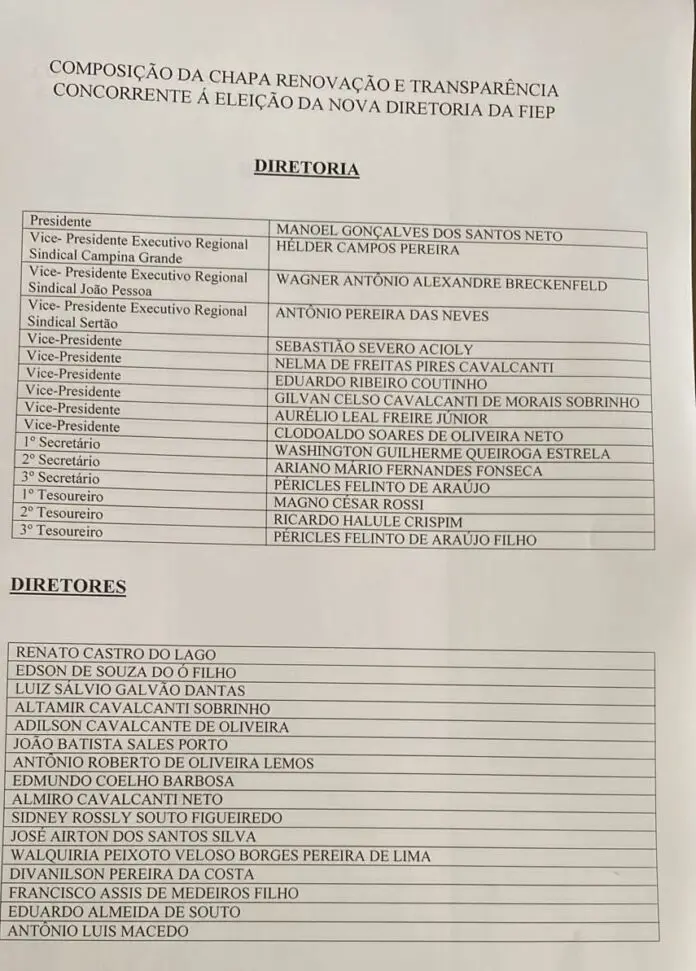 No dia de ontem (20), foi formalizado um grupo de empresários que decidiu concorrer ao comando da Federação das Indústrias da Paraíba (Fiep) com o atual presidente da entidade, Francisco Benevides Gadelha (Buega), que está no poder há 27 anos.
