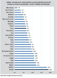 A Paraíba teve resultados positivos em todos os indicadores no mês de outubro. Na comparação do volume de vendas de outubro sobre o mês anterior, a Paraíba registrou alta de 0,2%, enquanto no acumulado de janeiro a outubro, a taxa de crescimento permanece acima de dois dígitos (12,9%). Já o País acumula alta de 5%.