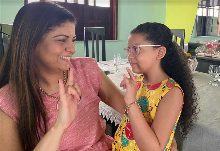Como a menina ama conversar, o idioma é até usado quando ela não pode usar a voz, lembra a mãe de momentos engraçados. “Quando ela começou a aprender Libras, uma coisa interessante, é que às vezes ela queria falar enquanto estava almoçando. Só que de boca cheia não podia, então fazia alguns sinais pra poder se comunicar pela ansiedade de querer falar logo”.