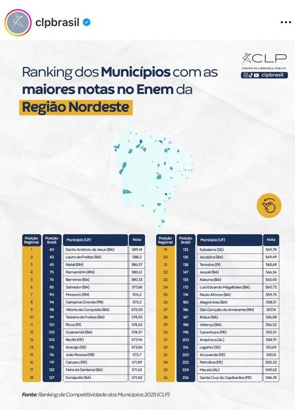 Foi divulgado recentemente a relação dos municípios com as maiores notas no Enem no Ranking de Competitividade dos Municípios. Os dados são do Inep/23. Neste levantamento Campina Grande volta a ser destaque obtendo os melhores resultados na Paraíba e sendo ainda o 8° município no Nordeste e o 94° no Brasil melhor posicionado.