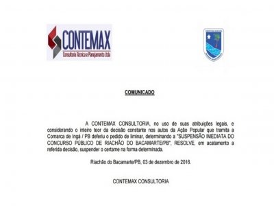 Em decisão liminar, o juiz Glauco Coutinho Marques, em substituição, acatou pedido feito em Ação Popular impetrado pelos vereadores de Riachão do Bacamarte, Maria da Conceição Viana, Luiz Rodrigues dos Santos, Severino Barbosa Monteiro, Josemar Campos, Flávio Cabral de suspender o concurso público marcado para esse domingo (04).