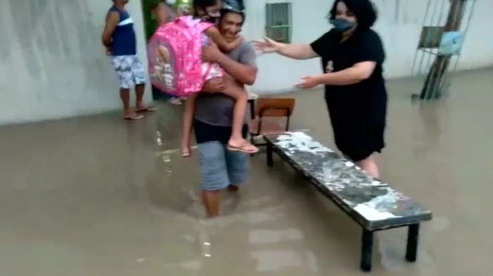 Vídeos gravados pelos pais dos alunos mostram quando os professores tiveram que pegar bancos de dentro da escola para construir uma ponte com o objetivo de fazer os estudantes passarem pelas águas e saírem da escola. Ionara Nascimento, que é mãe de um dos alunos, contou que a escola tem mais de 35 anos e que sempre foi uma rua de terra.