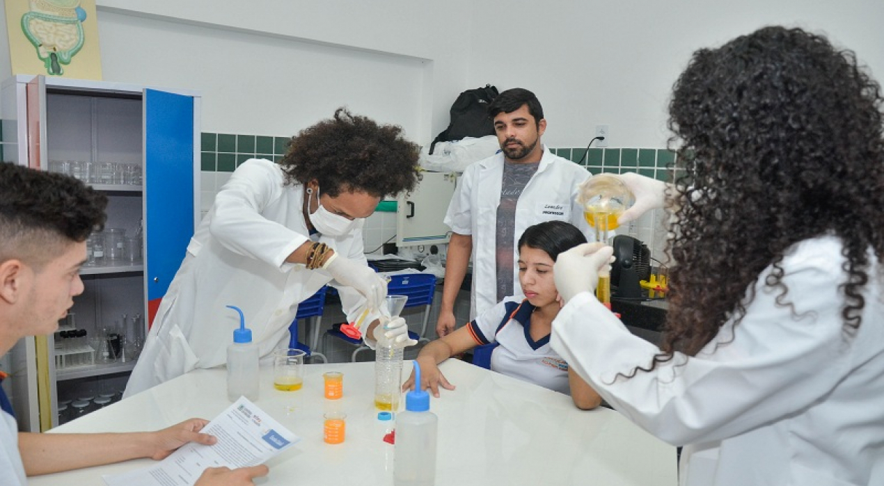 As experiências químicas realizadas em laboratório acontecem duas vezes na semana. Antes das produções é feita uma aula mostrando os produtos e reagentes químico que vão ser administrados. Em seguida, os alunos preenchem um relatório para saber se compreenderam o assunto que vai ser colocado em prática, e recebem coletes e máscaras para as aulas.
