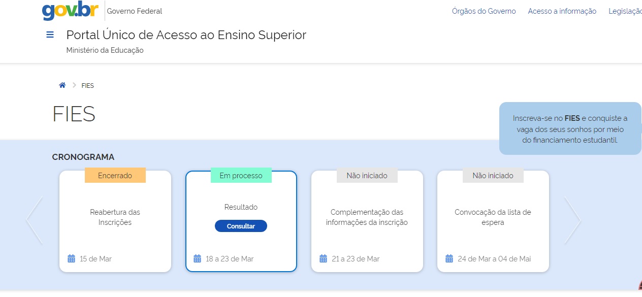 Pelo cronograma do Fies, a convocação dos selecionados na lista de espera deve sair no dia 24 próximo.