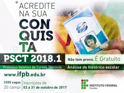 O Instituto Federal da Paraíba divulgou nesta quinta-feira (14), os editais do Processo Seletivo para os Cursos Técnicos (PSCT 2018). Ao todo, estão ofertadas 3.355 vagas para cursos técnicos integrados e subsequentes ao Ensino Médio. Para o campus Campina Grande estão destinadas 550 vagas. As inscrições vão de 02 a 31 de outubro através do preenchimento eletrônico de formulário e questionário socioeconômico disponibilizados no endereço estudante.ifpb.edu.br.
